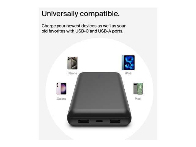 - Charge up to three devices at the same time with its USB-C port and dual USB-A ports