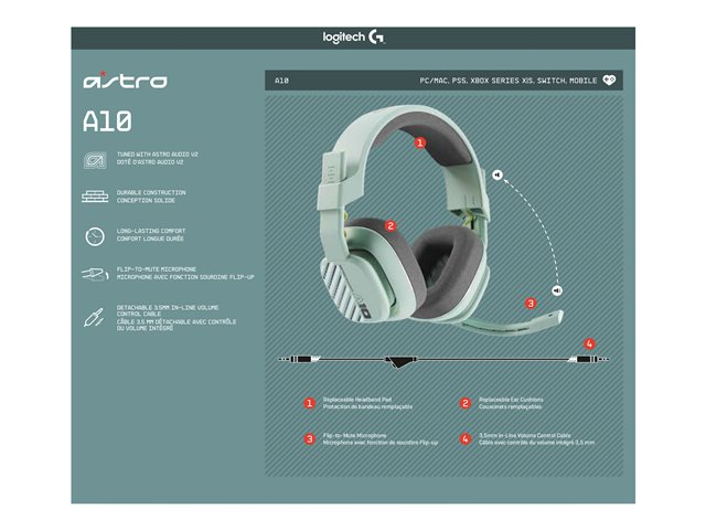 A10 Gen 2 gir nøye balansert high-fidelity-lyd med spesialtilpassete 32 mm ASTRO Audio dynamiske drivere for en oppslukende opplevelse. Den avanserte integrerte boom-mikrofonen kan flippes opp for å settes på mute for privatliv eller ned for krystallklare samtaler via en 6.0 millimeters mikrofon.