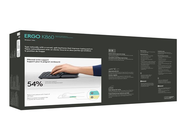ERGO K860 er et delt ergonomisk tastatur som er utviklet for bedre holdning, mindre belastning og mer støtte. Du skriver naturlig på en buet, delt tasteramme som forbedrer skriveholdningen din. Den unike formen reduserer muskelbelastningen på håndledd og underarmer - hendene og skuldrene får en mer avslappet holdning.