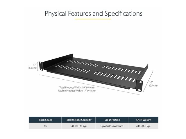 StarTech.com 1U Vented Server Rack Cabinet Shelf, 10in Deep Fixed Cantilever Tray, Rackmount Shelf for 19" AV/Data/Network Equipment Enclosure with Cage Nuts & Screws, 44lbs Weight Cap.